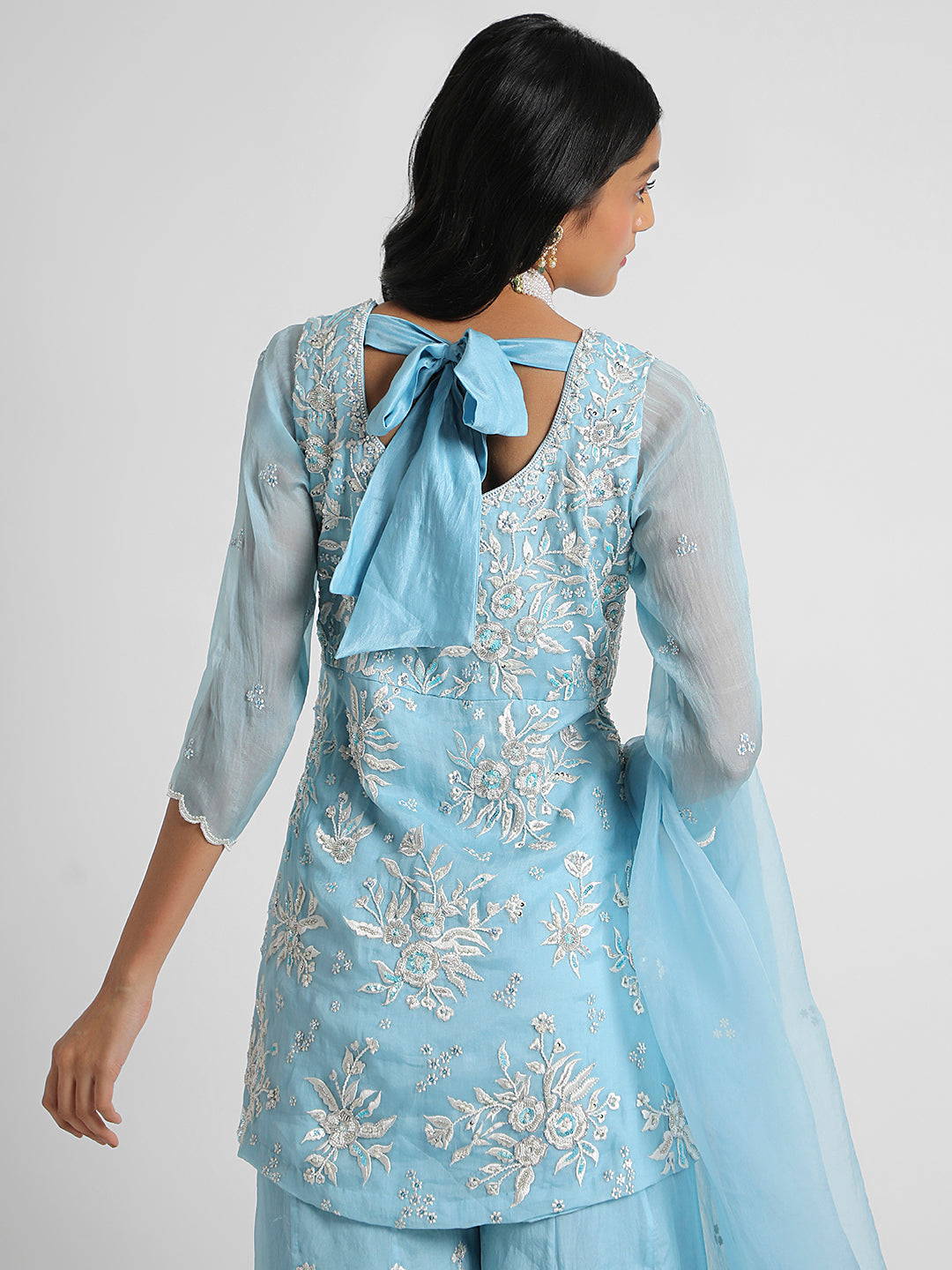 Step into elegance with the “Hydrangea.” The refined pearl hand embroidery and sequins intertwine in a delicate floral pattern creating a perfect blend of grace and contemporary allure. The ethereal pastel blue hue paired with the luxurious silk organza fabric will elevate your presence for the most special occasions. The classic silhouette features wide-legged pants, a harmonizing dupatta and a satin bow to complete the ensemble.
